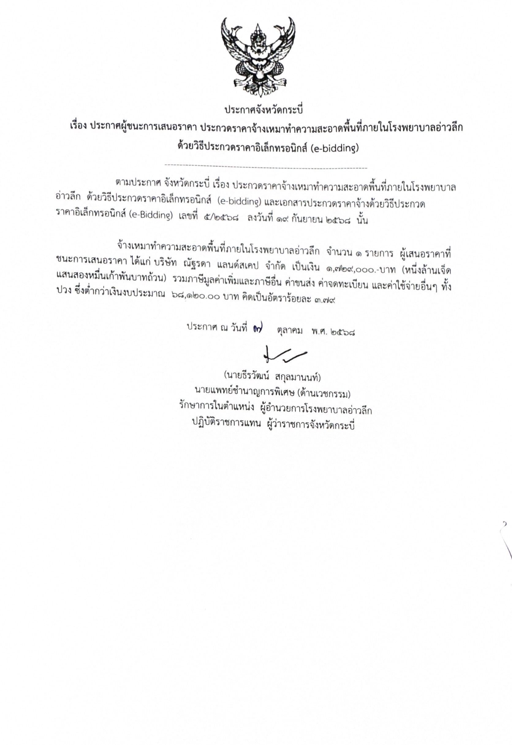 ประกาศผู้ชนะการเสนอราคาจ้างเหมาทำความสะอาดพื้นที่ภายในโรงพยาบาลอ่าวลึก