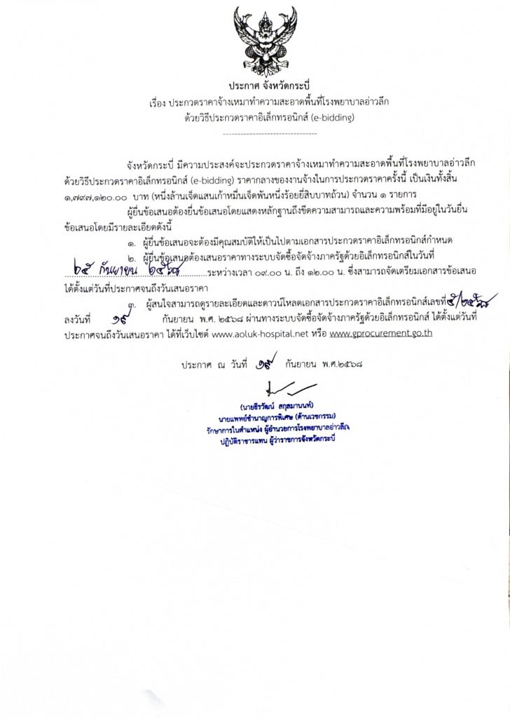 ประกาศผู้ชนะการเสนอราคา จ้างเหมาทำความสะอาดพื้นที่โรงพยาบาลอ่าวลึก ด้วยวิธีราคาอิเล็กทรอนิกส์ (e-bidding)