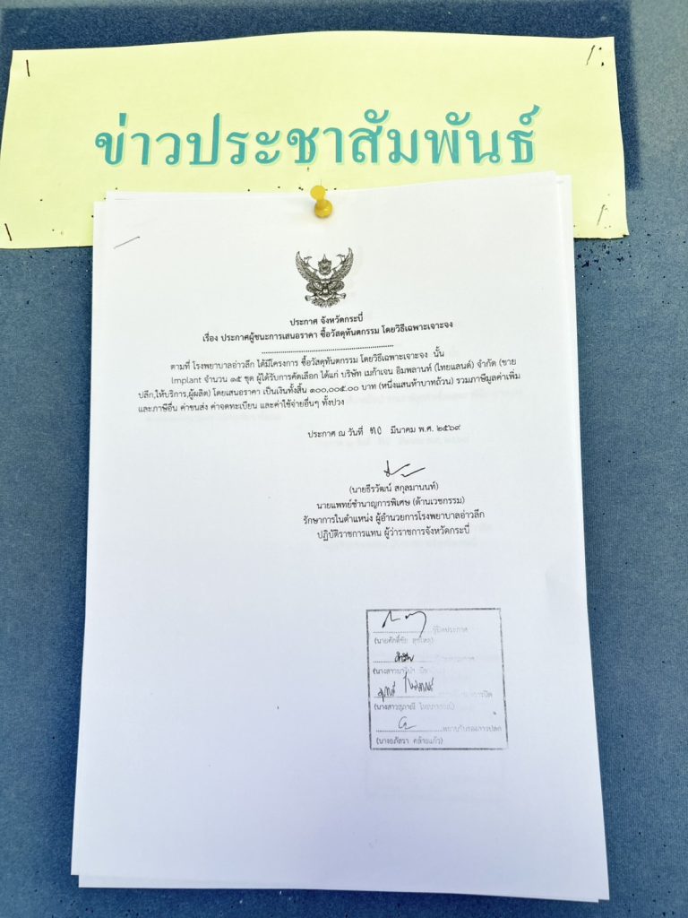 ประกาศผู้ชนะเสนอราคาจัดซื้อวัสดุทันตกรรม จำนวน 1 รายการ โดยวิธีเฉพาะเจาะจง